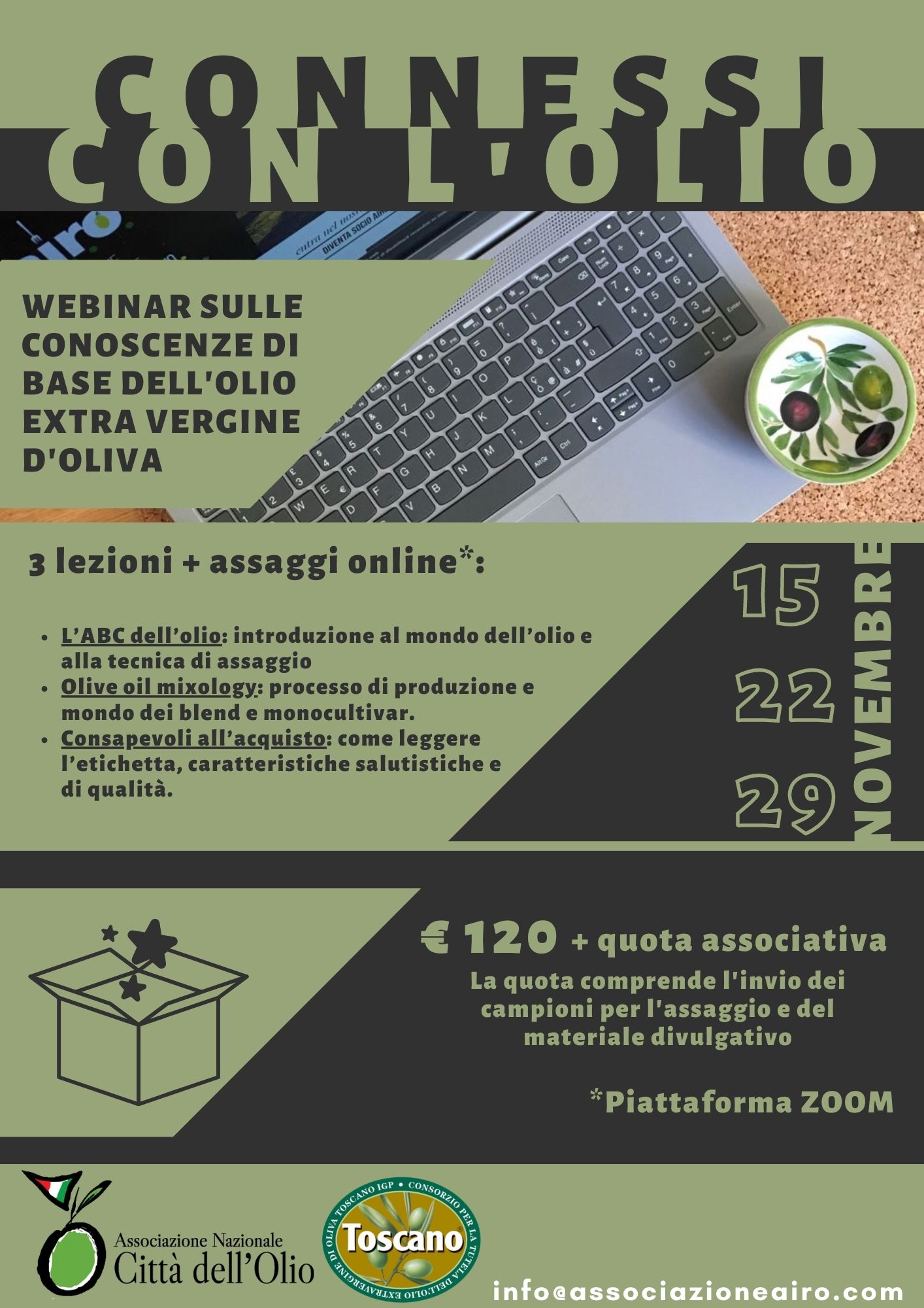 La missione di AIRO non è solo fare rete tra tutti gli attori del mondo olivicolo, ma è anche quella di fare divulgazione a tutti e in qualunque modo. Da questo nasce il webinar “Connessi con l’olio”, che in tre lezioni (sei ore) online vuole dare le nozioni di base a tutti i consumatori, e non solo, che sono interessati a conoscere meglio questo prodotto così prezioso.