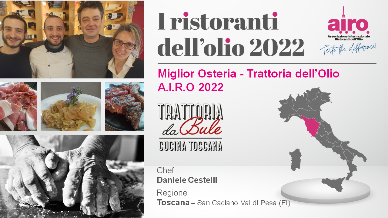- Miglior Osteria-Trattoria dell’Olio A.I.R.O. 2022 – Trattoria da Bule (Chef Daniele Cestelli) – San Casciano Val di Pesa (FI)