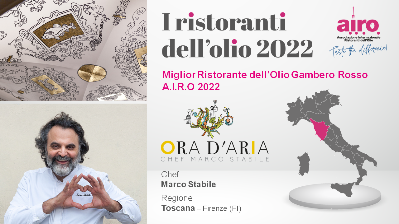 - Miglior Ristorante dell’Olio Gambero Rosso A.I.R.O. 2022 – Ora d’Aria Ristorante (Chef Marco Stabile) – Firenze (FI)