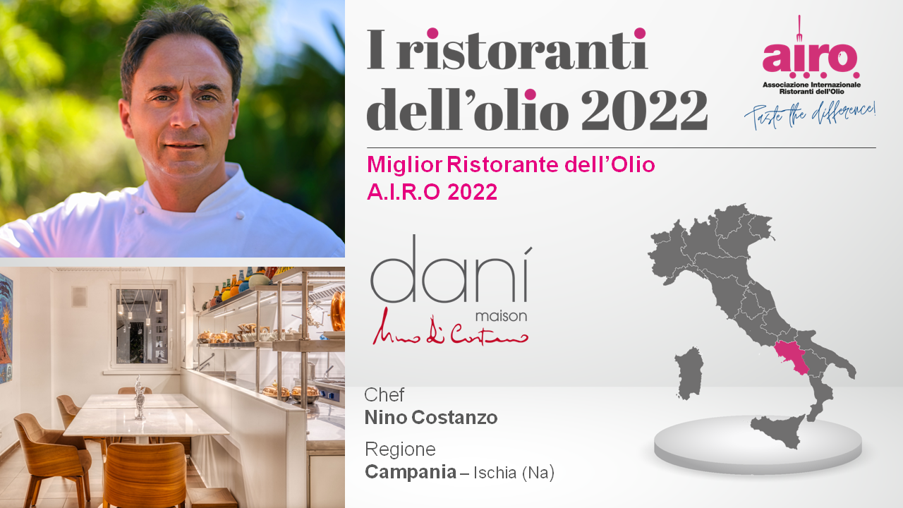 - Miglior Ristorante dell’Olio A.I.R.O. 2022 – Danì Maison (Chef Nino di Costanzo) – Ischia (NA)