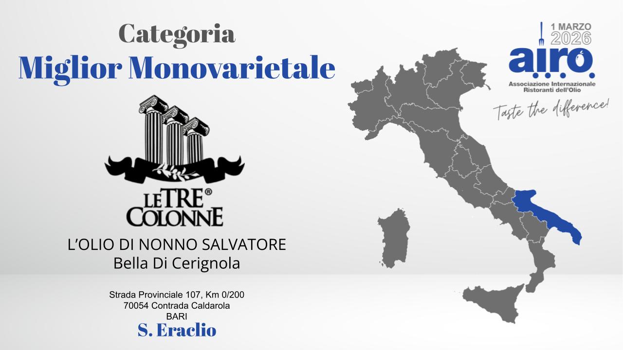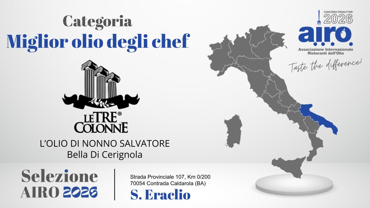 Miglior OLIO DEGLI CHEF: TRE COLONNE - BELLA DI CERIGNOLA - PUGLIA