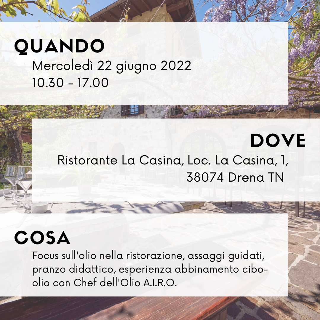 Il corso si terrà Mercoledì 22 Giugno dalle 10.30 alle 17.00 al Ristorante La Casina, Loc. La Casina, 1, 38074 Drena TN